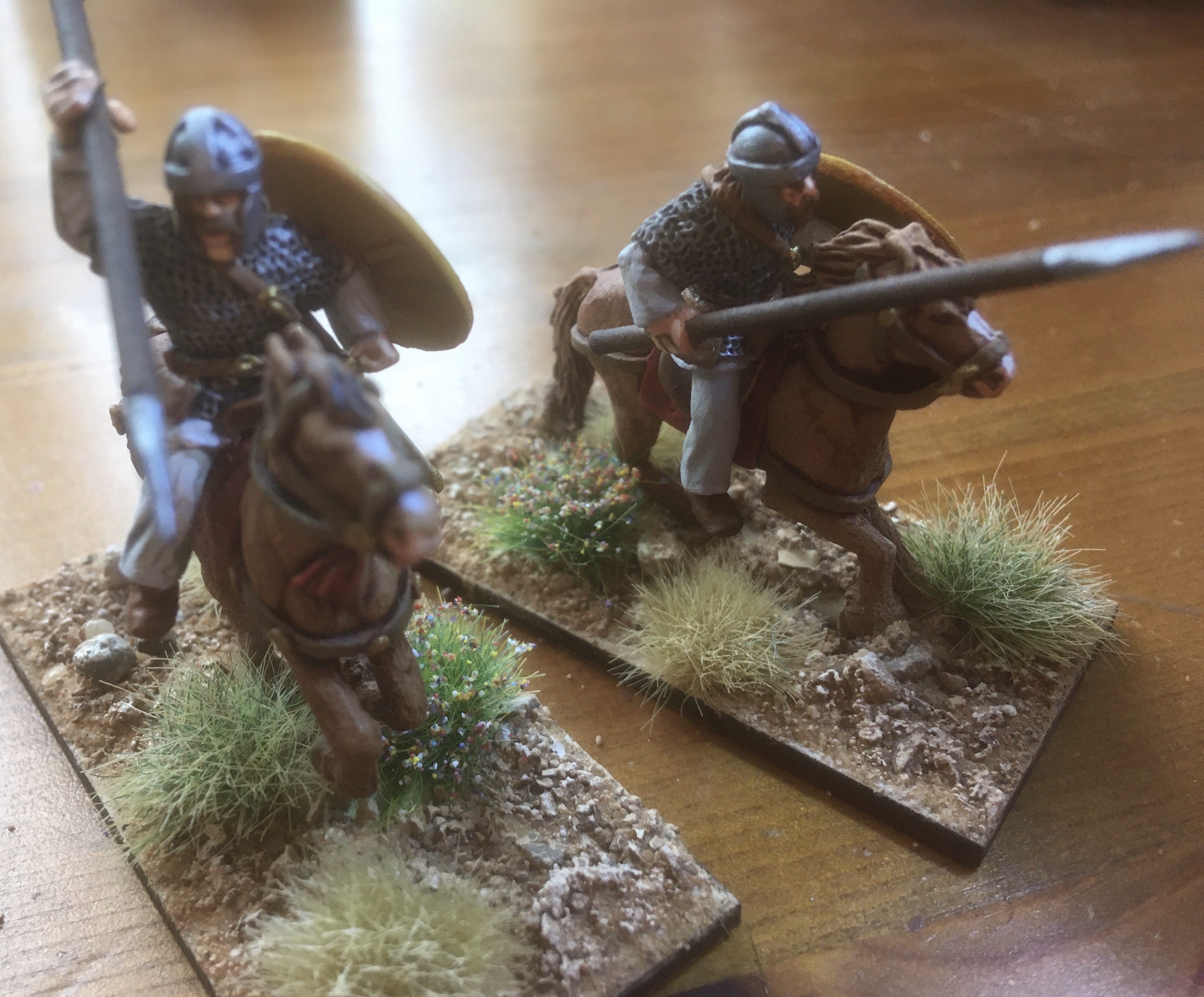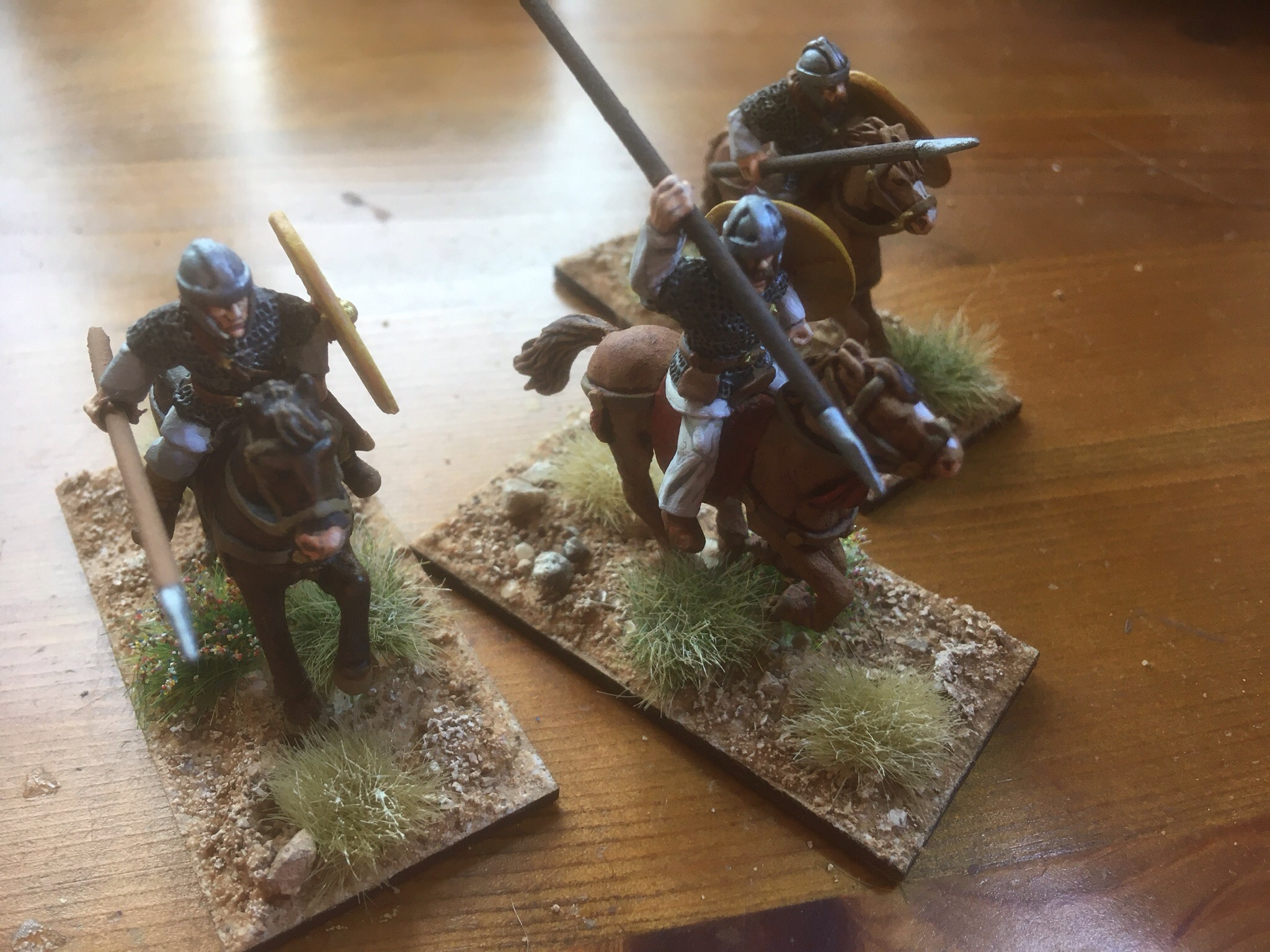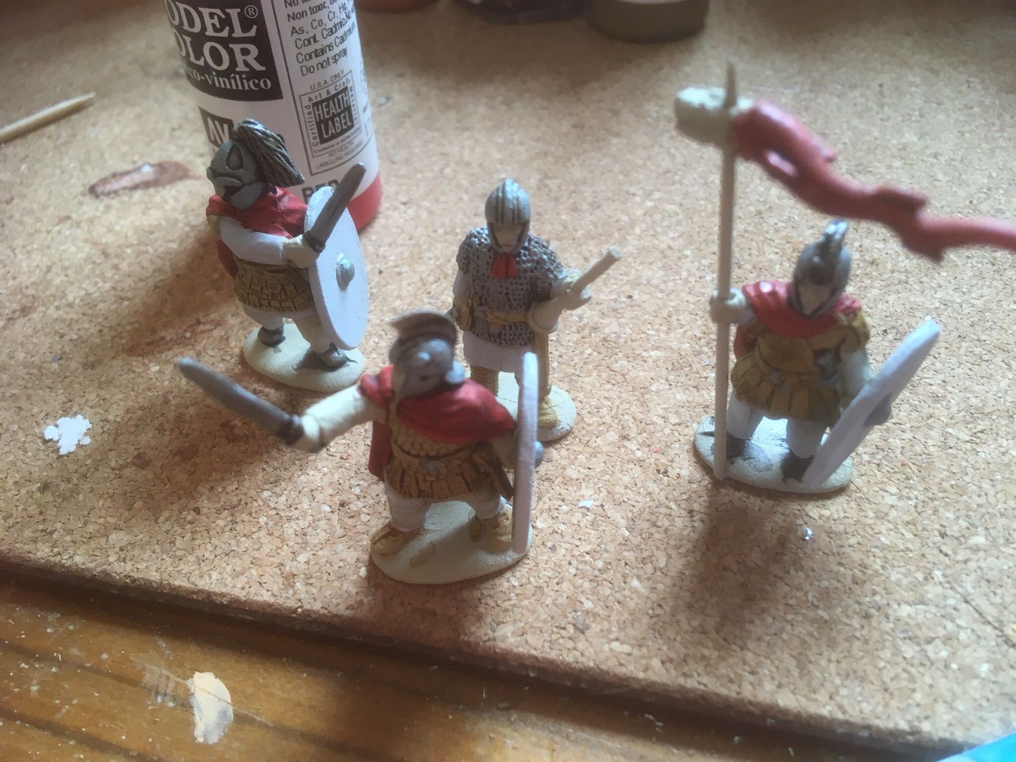 I hate wasting paint, I really should get a wet pallette. With the spare paint I started on a new Late Roman group. Again contrast paints and Little Bigman transfers came to the rescue! After a while day of Birthday wargaming, this little foursome was finished in an hour.