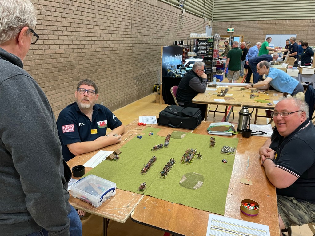 An early start was needed for a kick off time of anywhere between nine and ten dependent on who you asked!Once through the M4 Aust turnoff, it was plain sailing through quaint 1970s semis and the detritus of the nuclear power industry. Here and there were lonely Harvester restaurants with idyllic views across the Severn. Occasionally a pheasant would stir, nervous of the noises from the local dogging group. It’s like the Cotswolds without the tea rooms, or the filthy rich!You can always be assured a warm welcome from the locals. Here the local landowner Andrew Unwin DCA, Keith the organiser. ( seated) and a menacing Berkeley hooligan form the reception committee!Here an inquisitive local seeks knowledge from Paul and Mark. The arcane language of these top wargaming personalities is, I’m afraid, lost on the simple rural dweller…The hall was filling up now with plastic kits brought from near and far. Some we believe, came as far as Chippenham and Marlborough. But, for us the show meant wargaming.My Late Roman force faced everybody’s favourite driving instructor, Richard Walker in round one. Could my legions get to his 100 years war bowmen?The Romans made a brave show of it, taking Henry V to within one point of destruction.The overall quality of the minis was first class. Ghulams by Keith McGlynnGallic horse purchased by Lord Unwin’s off- shore earnings.And it was Andrew that I faced in round two. He sent a small corps of Celtic light horse and chariots to face my foot. Meanwhile a massive sledgehammer of woad warriors slammed into my flank.The Gallic hug!Testing the rules to the limit: Asterix would have been proud of the antics of his wheeled dare devils.It was my favourite Roman general who had to hold back the horde but not with that dice roll. Thankfully young Flavius had left the kettle men to their own devices the turn before! a narrow losing draw to the Romans.