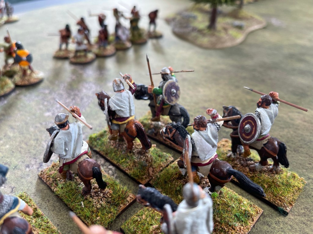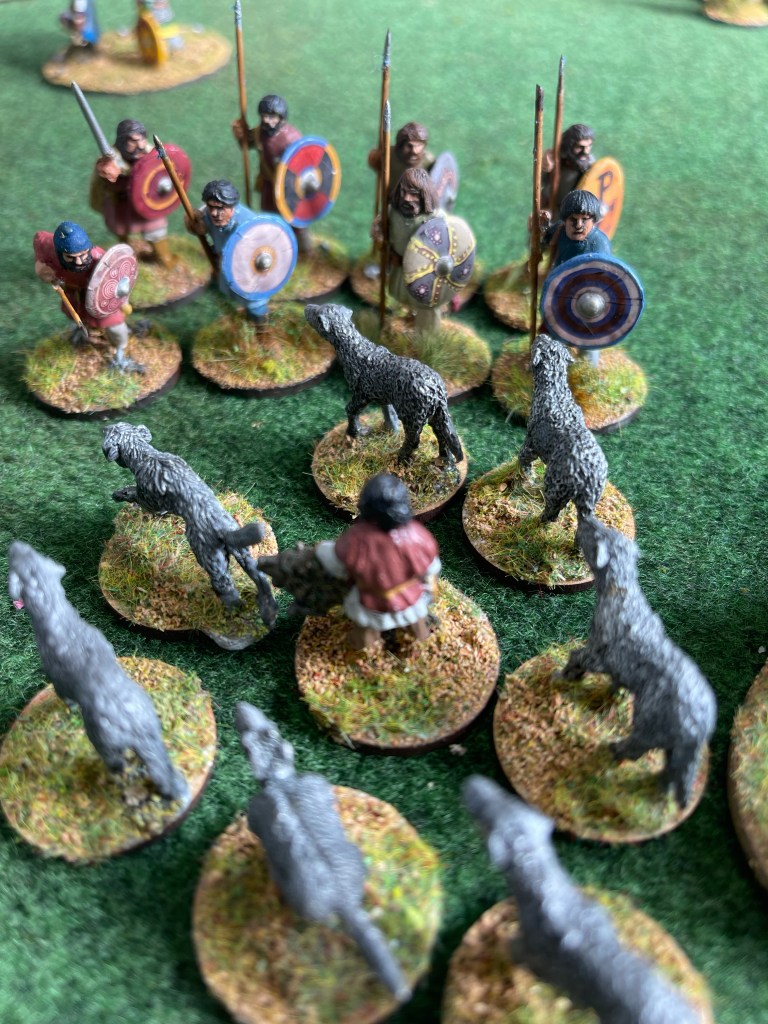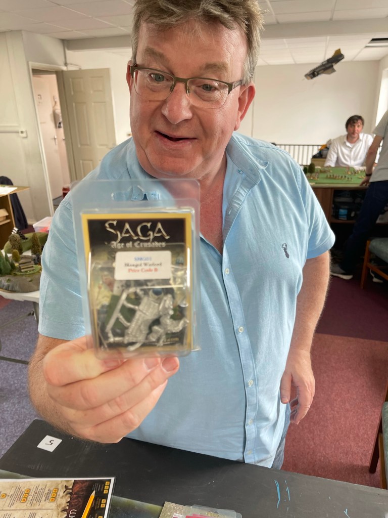 Steve had a working knowledge of SAGA, John is going to pick up a copy of version one when the price drops and I had a quick run through when I was driving on the straight bits of the motorway. Richard provides all that is required and after a quick run through , we were off!A good turn out with a great atmosphere!The tables were fixed terrain with battle boards and army lists all readily at hand. Any special rules were typed out on cards and explained by our host ( below)Richard explaining elephant combat to the newbies!Each player was promised two games of the new Age of Hannibal. John in fact had three games of the new supplement.In game one, I commanded Carthaginians and went for a massed citizen horse flank attack!On other tables, the Welsh surround the invaders! An ominous event.Dark Age colour on other tablesAn elephant in distress against the Numidian.John in distress as his pretty Greeks meet stiff opposition.Richard provided all the minis and they were all beautifully painted.My Carthaginians had stalled to a draw against the Republican Romans but in game two my Welsh superheroes tabled the Saxons. Eight hearthguard with javelins can make a lovely dent in any opponent!Welsh nobles: the battle winner! Ever the picture of generosity, Richard awards me a prize for archery! A mongol general as booty and leading the competition going into round three!My warband assaults the woods but I am deterred by the Goth arrow storm!I had intended to clear the woods with my war dogs but you can’t risk man’s best friends!Visigoth mercenaries take on my hearthguard and win!He will need his warlord to finish off my guard!My wardogs take out a Goth warrior unit!The heartless Goth commander kills my hounds!Elsewhere Steve rampages through the opposition to steal third place. I was happy with two places below that though😓😓😓😭😬😭😅😳🦅Thinking the day, we had learnt a lot; we hadn’t been playing incorrectly on club nights but we had picked up a number of pointers. Two shots from archery before fatigue sets in was my abiding lesson, that and the utility of a war dog pack ( no terrain negatives and your opponent can’t burn their fatigue!SAGA is such a great game and Richard has promised to bring his ironman day to Cardiff soon! We were all pleased with our competition placing and look forward to our next event. John was a little dejected but once we had explained you no longer had to pay bridge tolls on the Severn Bridge, he recovered.What a day! Thanks to all!A memorable outing!