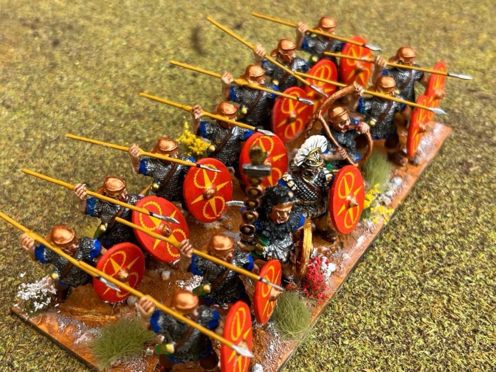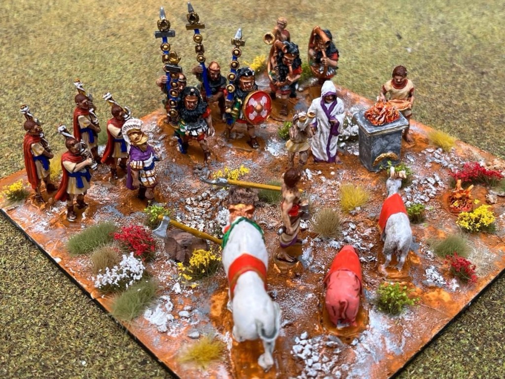 All are Foundry figures save that the Lictors and officiating Haruspex, his assistants and the Bull are from Footsore Miniatures. The man with the Pipes and the long trumpet (both shown on Trajan’s Column) are from Eureka’s Macedonian range, hence the very short tunics. The pig and goat are from Pendraken.