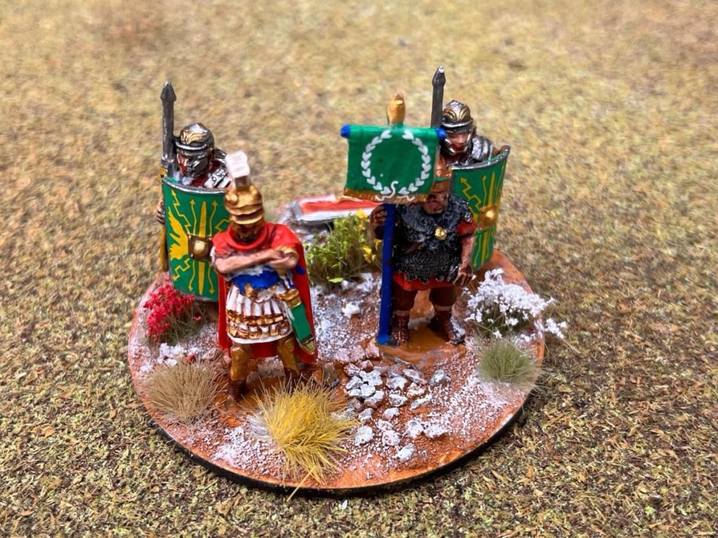 The camp is based on various scenes on Trajan’s Column where the Emperor is taking the Auspices in front of the army’s standards by sacrificing a Bull (definitely not Tommy Steele’s “Little White Bull”), a Goat and a Pig. All are based for “To the Strongest!” though the Camp is on a 15mm square base so will entirely fill up a 15 cm grid square.