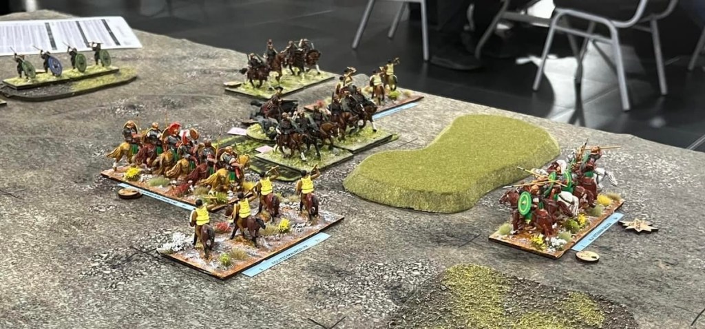 I outscouted the enemy so I was able to deploy second and move first. I planned to attack with my Eastern troops from the client state of Commagene led by Prince Antiochus Epiphanes. I hoped to bring massed archery from my Bowmen to bear on the Roman horse. However the opposing Equites Contarii charged into my archers before they loosed a shot. However amazingly my archers, despite being disordered, held out to James’ chagrin for four turns. It was mainly a failure to hit on the cavalry’s part though I did save the occasional hit.