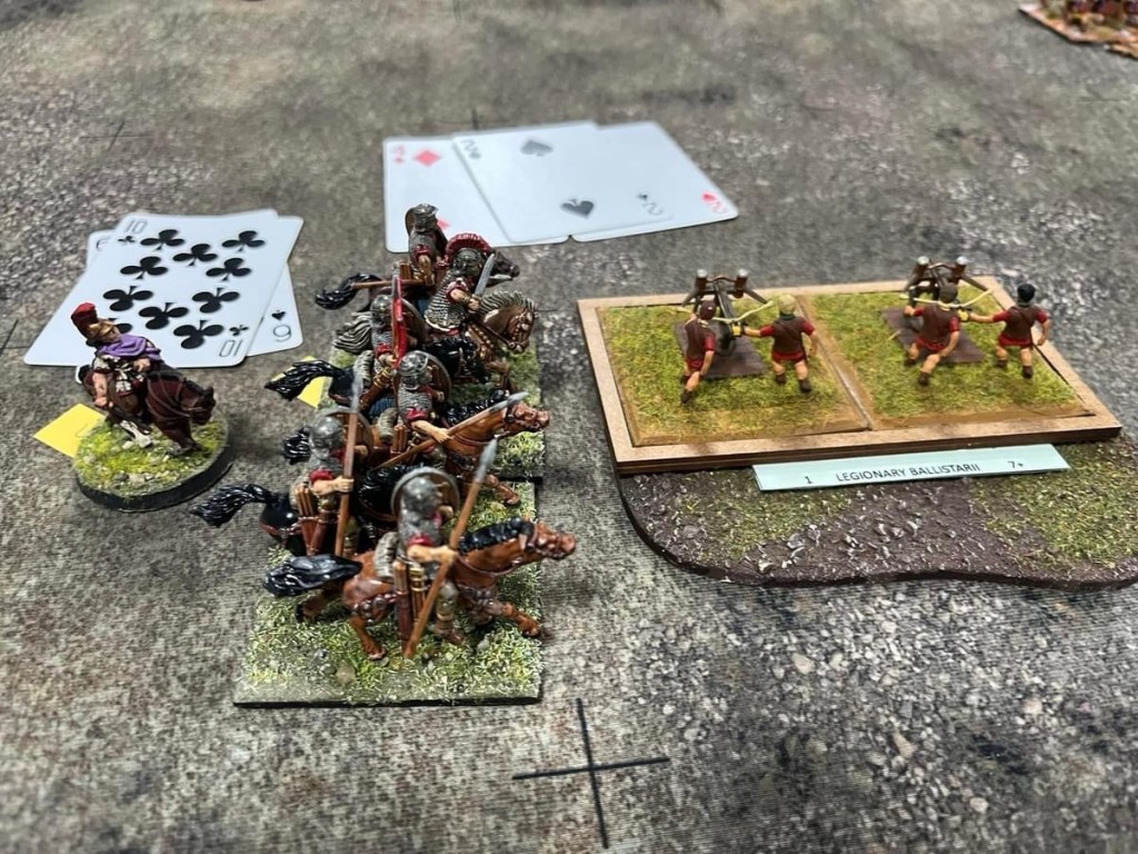 After missing my weekly pilgrimage to Firestorm Games last week due to James Churchill succumbing to COVID 19 again, James and I were to play our postponed First Century AD Roman Civil War with our respective new armies. As usual we used “To the Strongest!” and 150 points each. The armies were similar though I used more eastern troops than James who had brought two units of ballistarii ready to deter the sadly absent Douglas Baldwin. He has an effect on us even when he isn’t there.