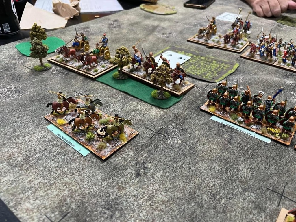 They started by moving chariots and light horse straight towards the woods as if they would be able to pass through them with ease! Surely some mistake? No, no mistake, they went through them like knives through butter, my defensive plan fell through.