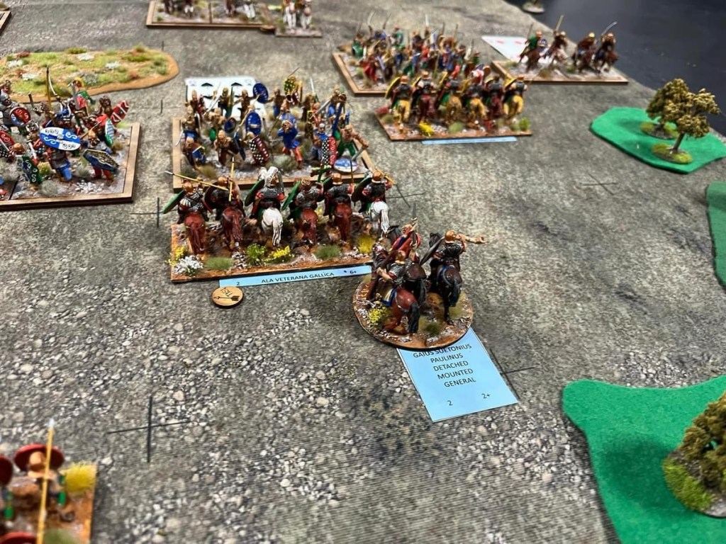 Were the Gods deserting Rome? I needed a “10” to charge again. I drew a “10”! Another hit! Mr Baldwin saves again! No more “10’s” for Paulinus who had to pull back as other Britons moved up to rescue Boudica. In a subsequent fight the Roman Ala was hit. They saved but Paulinus drew a “1”, he then drew again, a”10” and the Governor fell at the head of his men. However that lost his army its last medal and therefore the battle. Perhaps in our alternate history that also cost Rome its Province of Britannia. The Druids it seemed still wove powerful magic despite our efforts on Mona only months before!