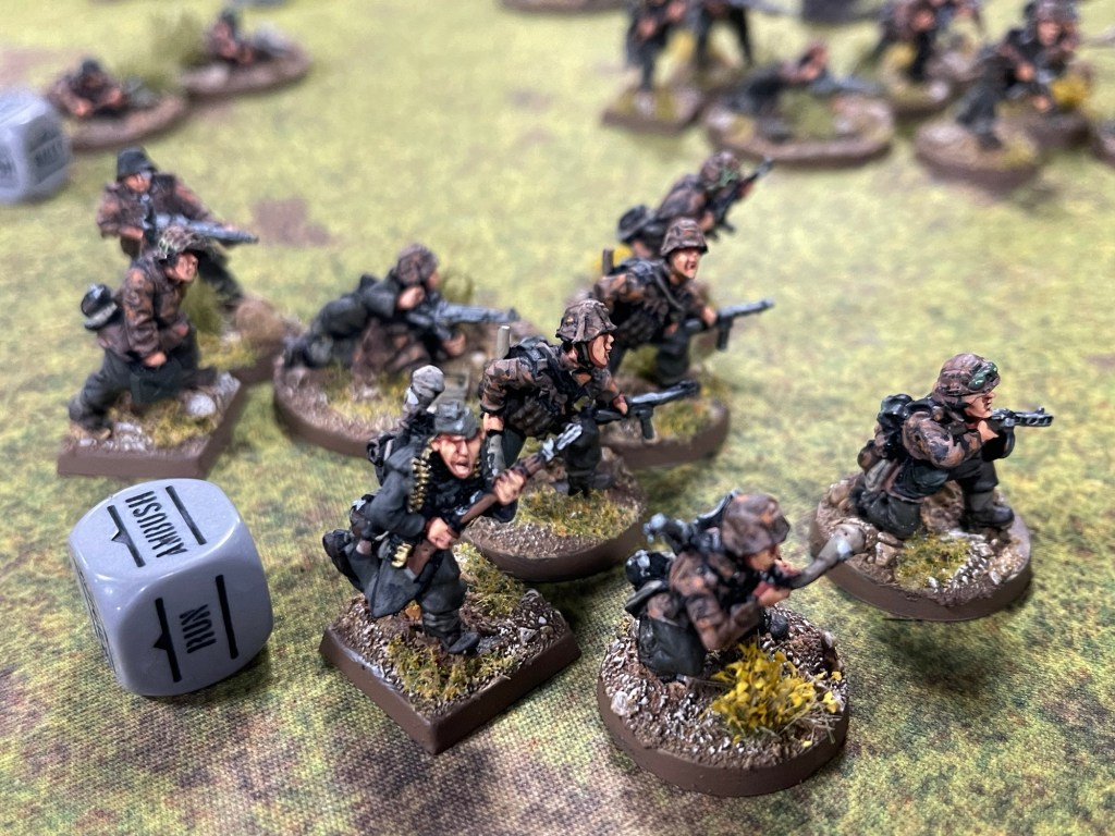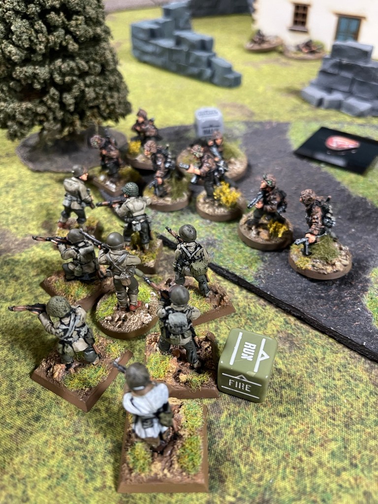 The close combat rules however are so blood thirsty! Assaults take simultaneously now. In the picture above the brave GI’s skillfully avoided defensive fire by being within six inches. However, the SS automatic weapons tore through the Americans.