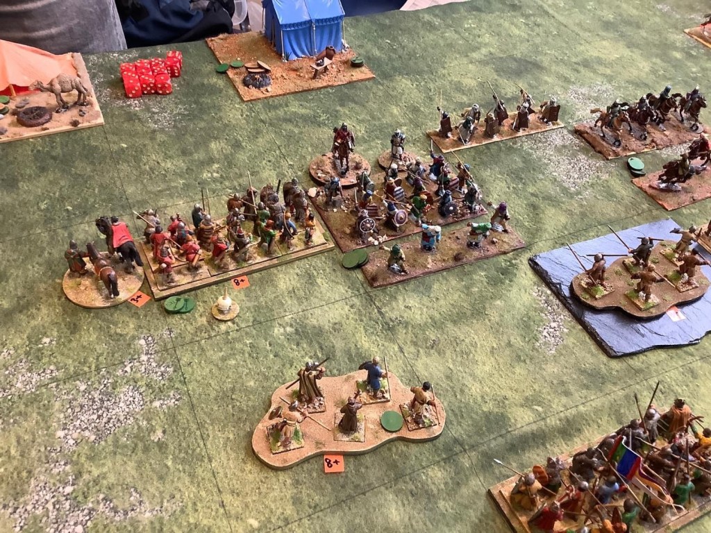 My left flank drove through his lines turned and seized a camp for the win. My rubblish infantry even made good pressure, although my right collapsed and he seized my camp. So I got a 13 medal win and Marc had 8 of mine.