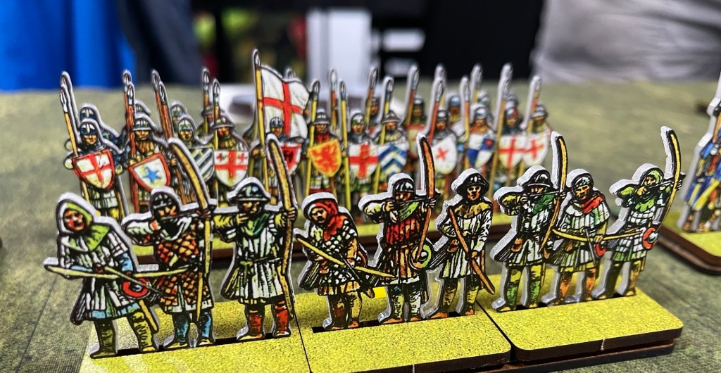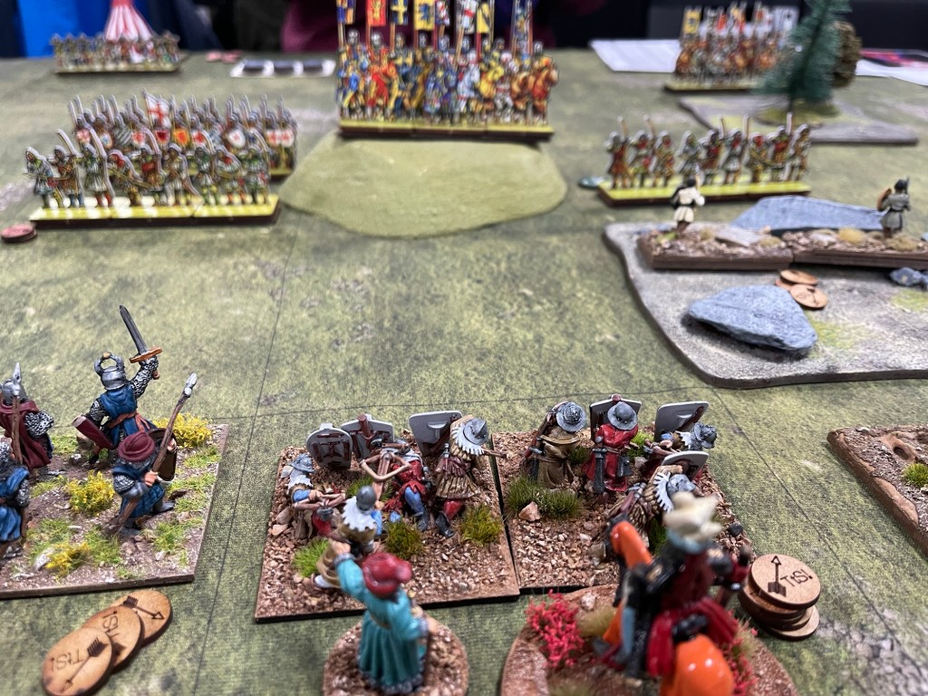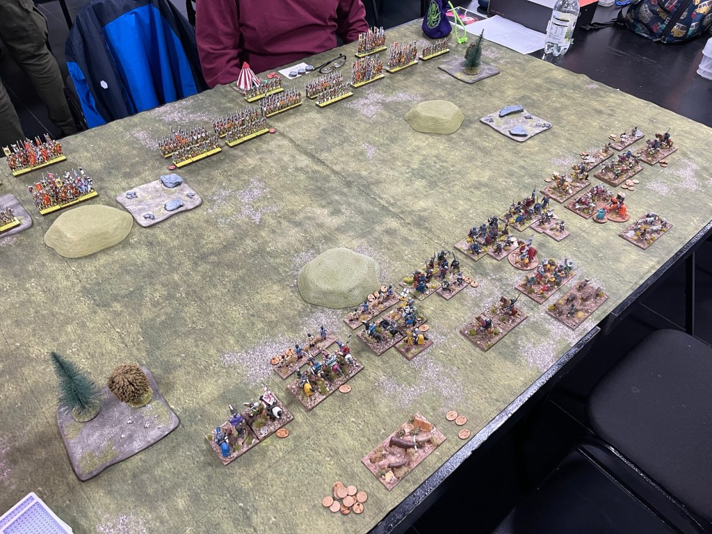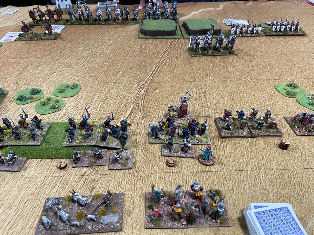 The crunch in game three was audible. What did I conclude? Heavy foot are reliable and missile support is a no- brainer! If you are using knights then two was maybe not enough. Lights on an open battlefield are going to be vulnerable. So no great surprises but I also failed to appreciate the scoring. It’s the medals that count not technically win or loss! My tourney army has to take coins in quick succession and in 2024 rallying can cost you.