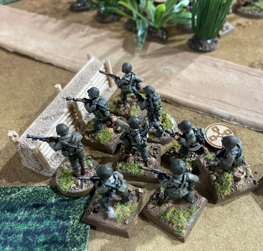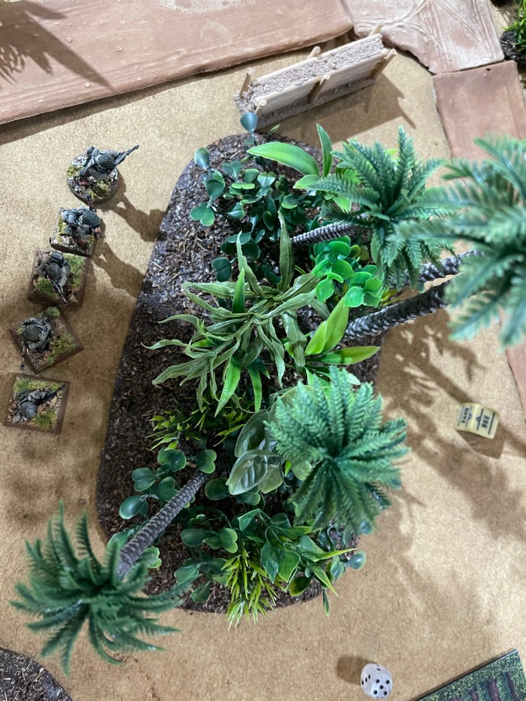 James had scoured every aquarium shop to get the jungle on table. Nice looking foliage but not quite fitting the rules. We decided on hard cover and then after the first US shots hit home, James graciously decided that the foliage blocked line of sight! Second thing I liked was the smaller number of factors “ to hit” , cover saves have been added. This made it faster to work out; no half range to measure or accounting for small teams.