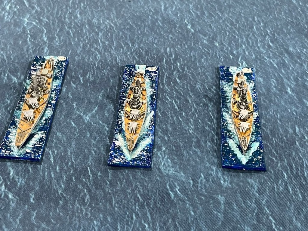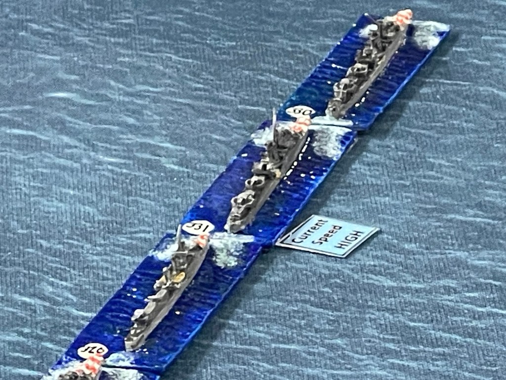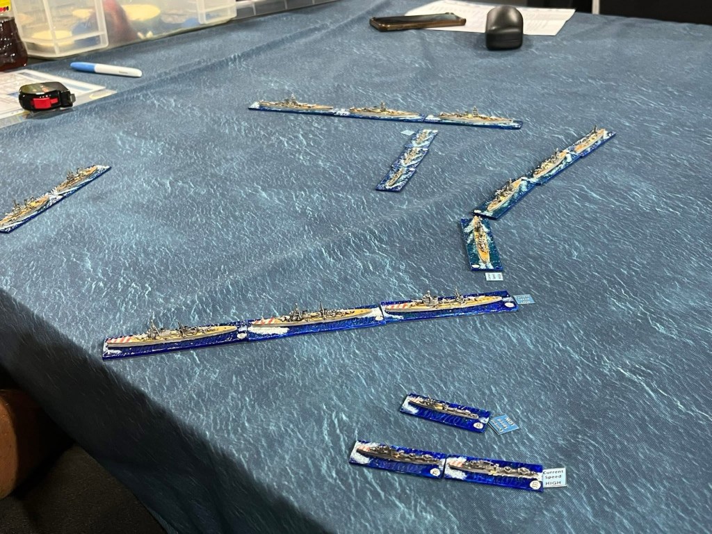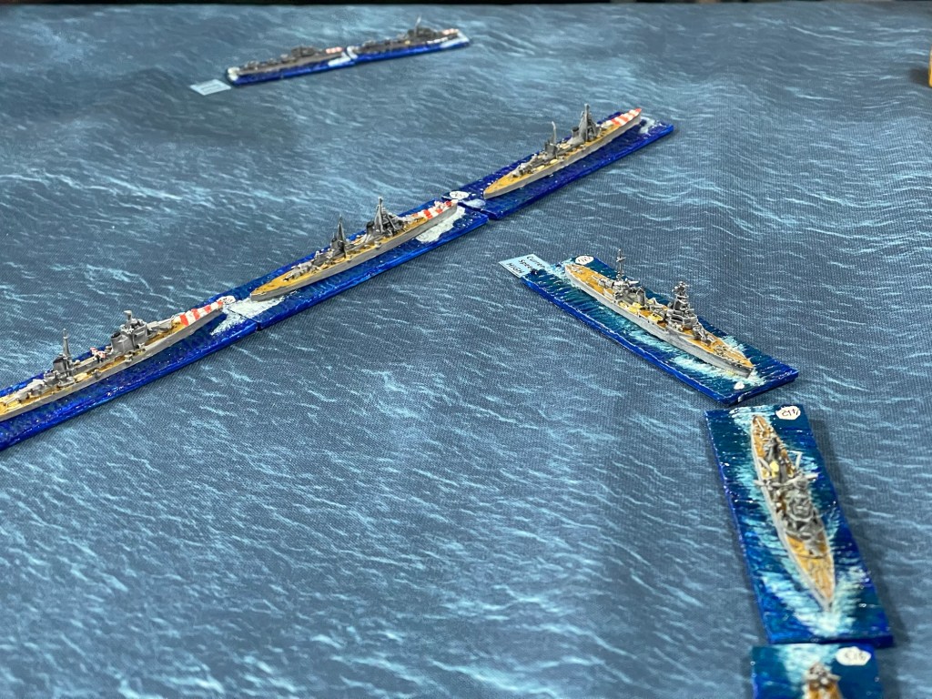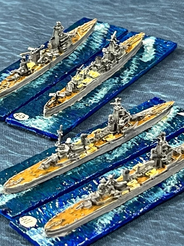 I commanded the four French cruisers which I had steaming down the table edge hoping to outrun the Italians. The six Italian cruisers split into two groups one speeding along matching course for course and attempting to close the range. The other three headed towards our wake intending to cross out “T”.