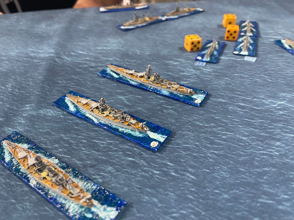 More Nimitz action last night, this time at Firestorm Games where Douglas Baldwin commanded the Italian Regia Marina while James Churchill and I commanded the French Marine National in a fictional action set in June 1940 before France has signed the Armistice with Germany. Enraged by “Il Duce’s” stab in the back, the French Navy has sent four cruisers to carry out a night-time bombardment of Genoa to gain some satisfaction.