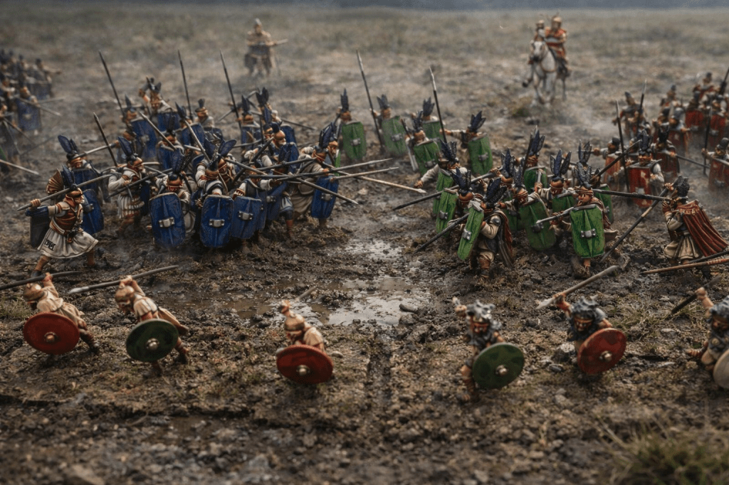 The historical account was that in rain and mist the armies came together. The Seleucid cataphracts charged the Roman left smashing through the legions who had never met them before, driving this wing back to the camp. Meanwhile on the Roman right the Pergamene allies under Eumenes used their light infantry to drive back the Seleucid scythed chariots who turned back into their own cavalry disrupting them and allowing the Roman and Pergamene cavalry to sweep away the disorganised Seleucids.