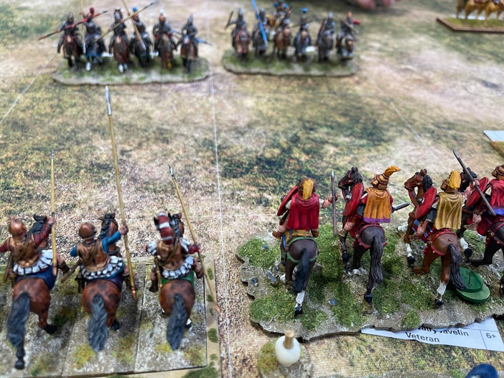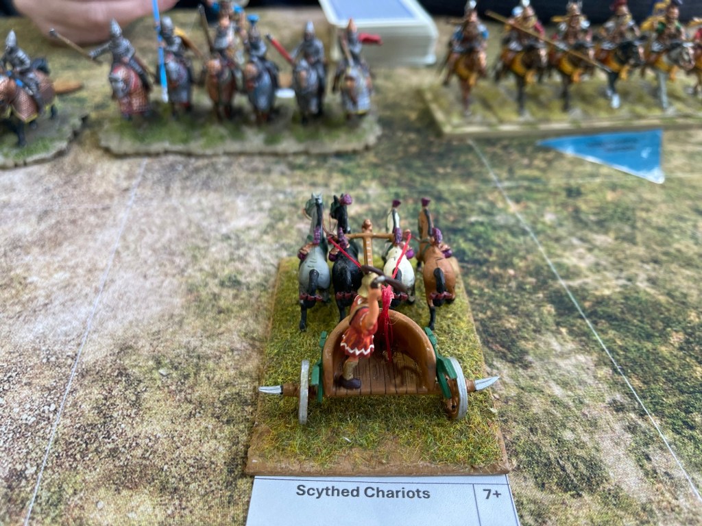 Seleucus (Michael Lane) threw his scythed chariots forward, well tried to, as he drew an ace. This slowed down his entire wing. Eumenes and the Pergamene allied with Roman cavalry support opposite, did little better.