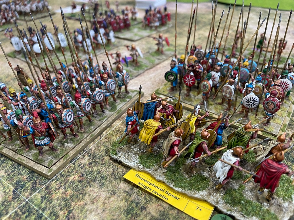 Historically the phalanx was deployed with elephants between units. Generously, this gave the Selucids an extra attack dice, hitting on an 8 though. The phalanx was also deployed 32 deep so could take four hits! The Romans were in for a tough fight!