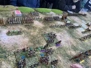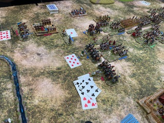 The centre was doing much better continuing to chip away at the centre pikes who had lost their integral elephants. If the pike failed a save on an ace then it not only lost a hit but had to make a further save against an integral rampage plus a normal rampage was made to the rear. So although the pikes had 4 hits and an extra attack, it could go wrong. Eventually it did!