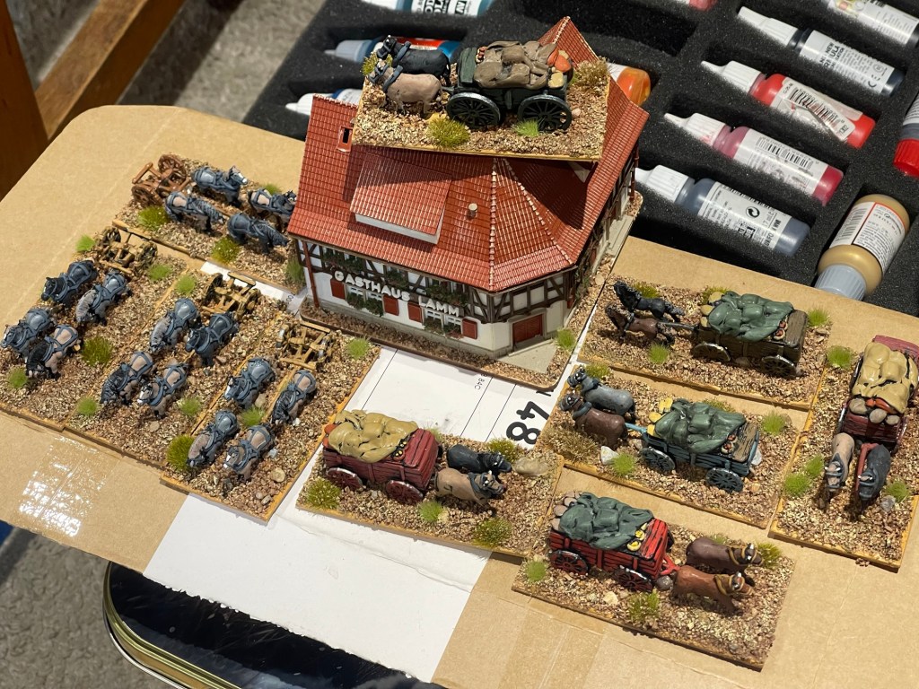 It’s been a strange sort of weekend, the good news is that I have two new gamers on the drive to the club. The bad news is a shared workspace and materials. Already they are eyeing up my rattle cans. To calm my nerves I finished the rebasing of my Renaissanc French baggage. If only GW did 15mm!