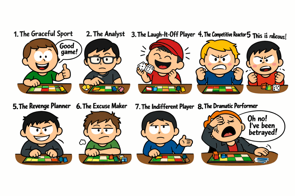 Gets visibly frustrated, blames luck, dice, or randomness Needs a short cool-down moment